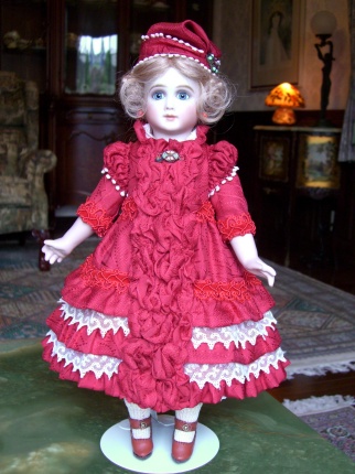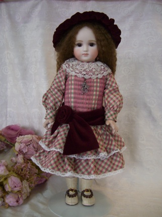 熊本のNKさんの作品です。 ちりめんの深いエンジがペールブロンドの髪に良く似合っています。 レースの使い方もいい感じです。 |