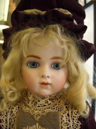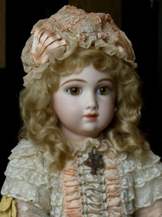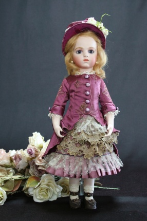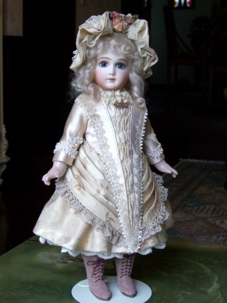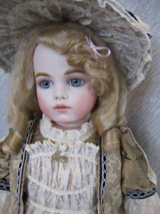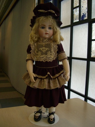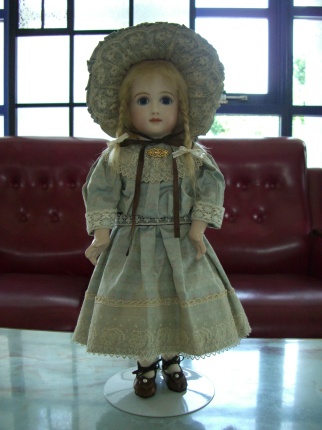 アンティークローンのドレスから仕立ててあります。 これほど大きな人形になるとバランスがほんとにむつかしくなります。 さすが美知子さん、華やかな中にもシックにまとめてあります。 |