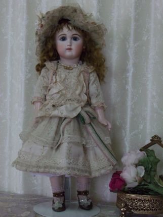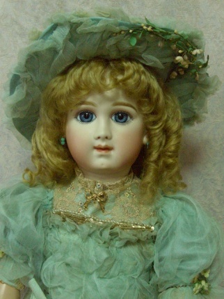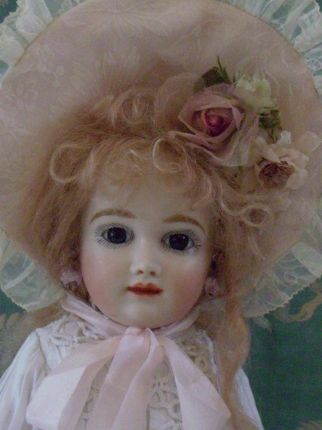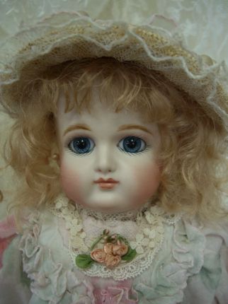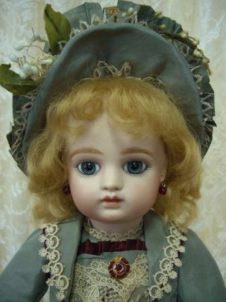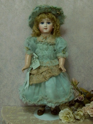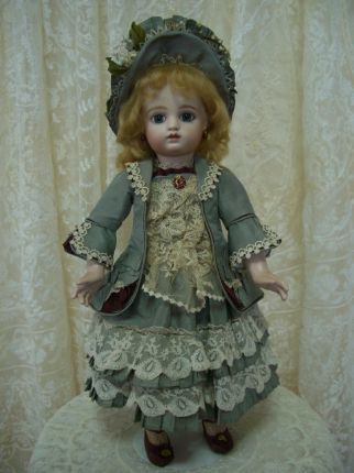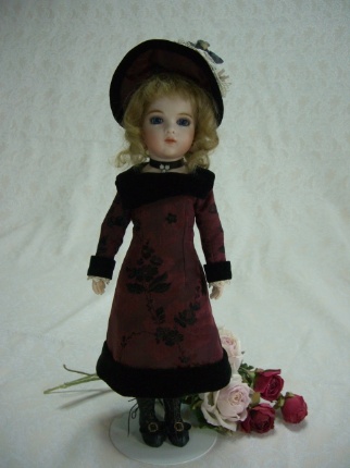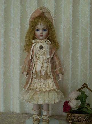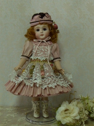 お人形に、とてもよく似合うグリーングレーのアンティークドレスから作りました。 シルク地とシフォンが同じ色、申し分ありません。 絵付けも上手になりました。坂本美知子さんの作品です。 |
